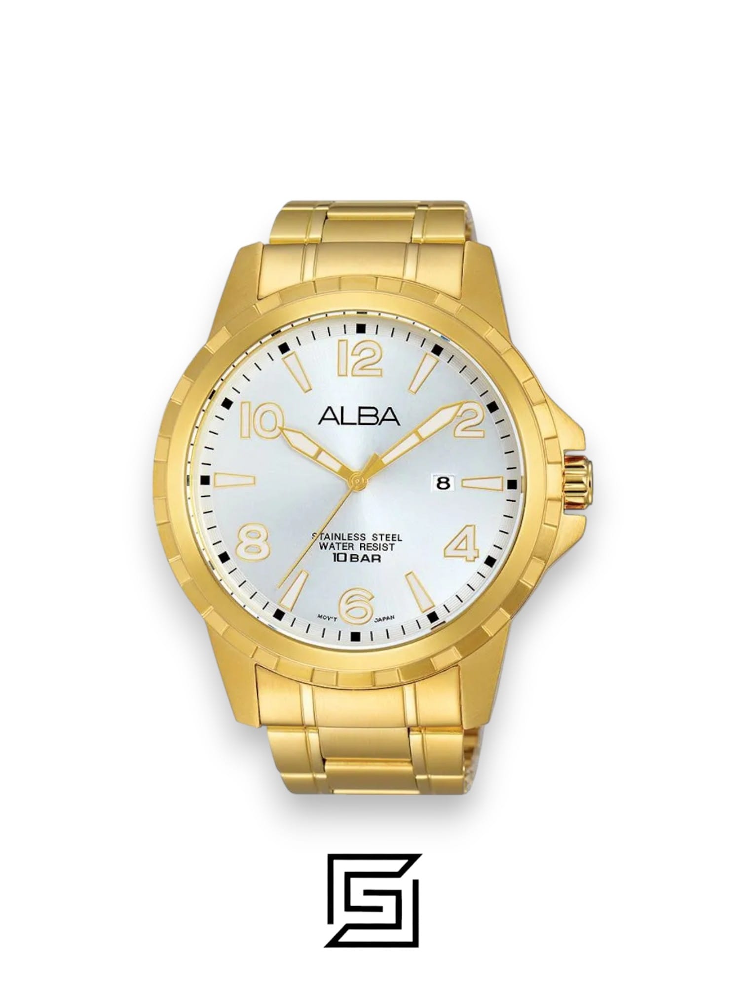Elevate your style with the ALBA Men’s Prestige watch. Featuring a golden stainless steel bracelet, silver white dial, and 100m water resistance. Japanese movement, 1-year warranty. Mineral crystal glass, date display. Perfect blend of luxury and durability.