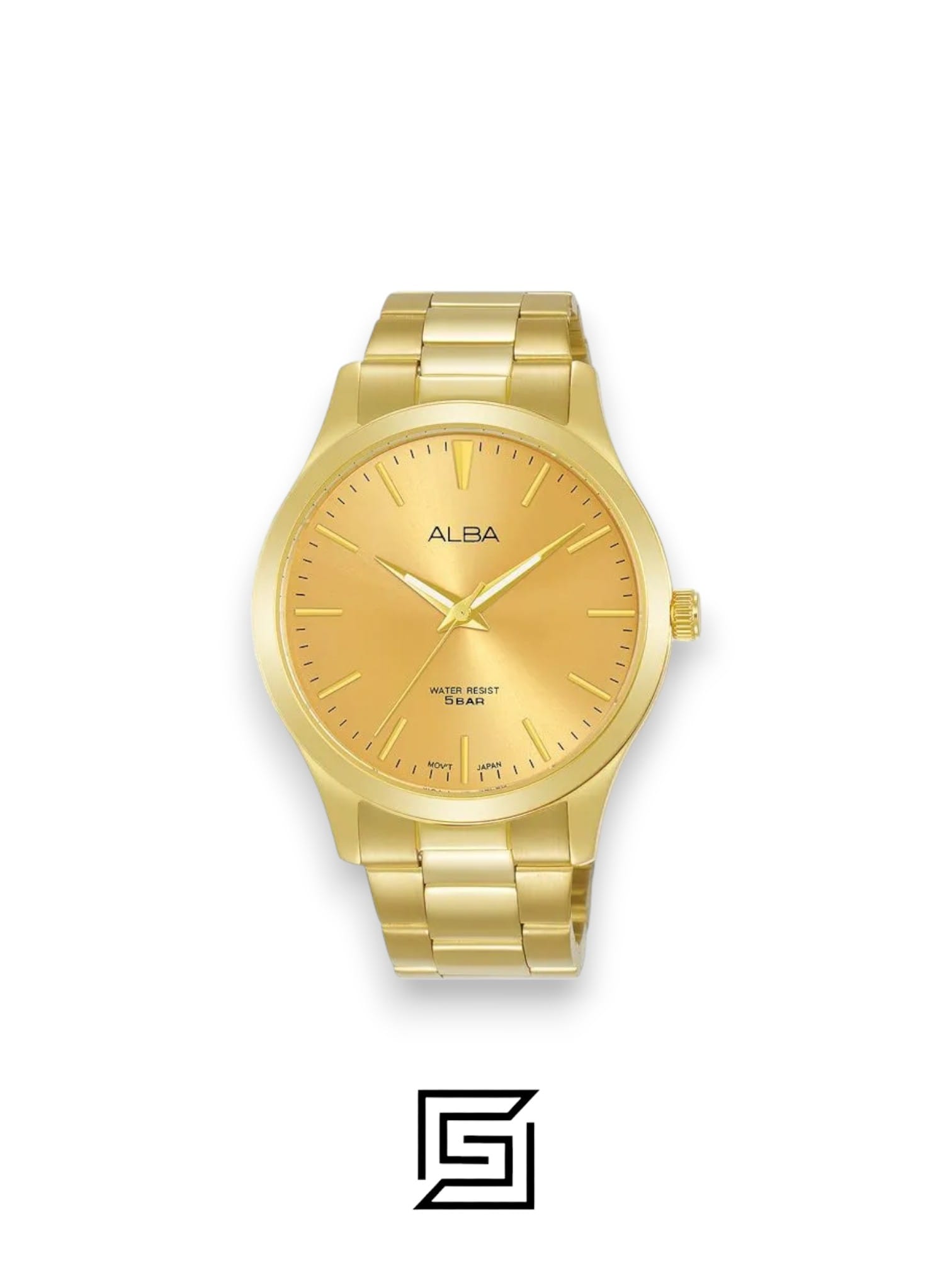 Stylish ALBA men’s stainless steel watch with a gilt dial and mineral crystal glass. 50m water resistant. Includes a 1-year warranty. Perfect for everyday wear.