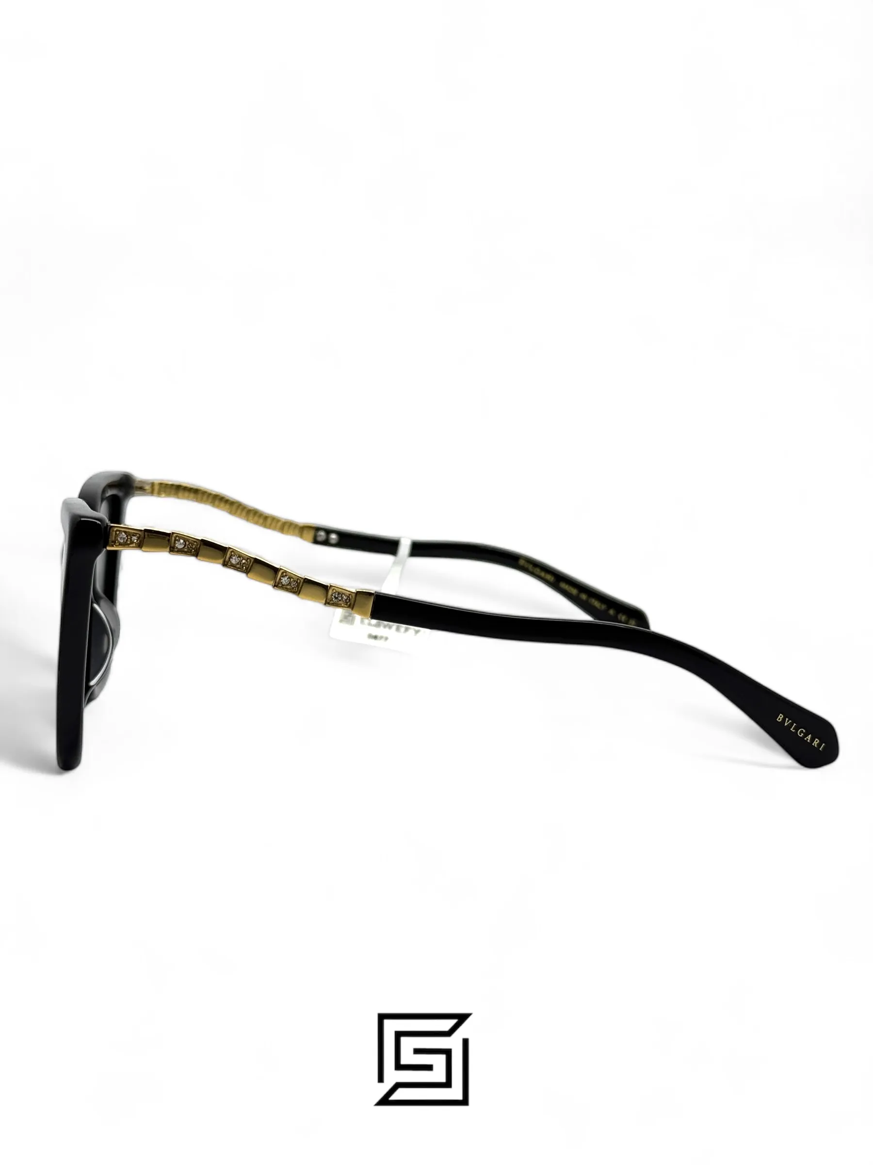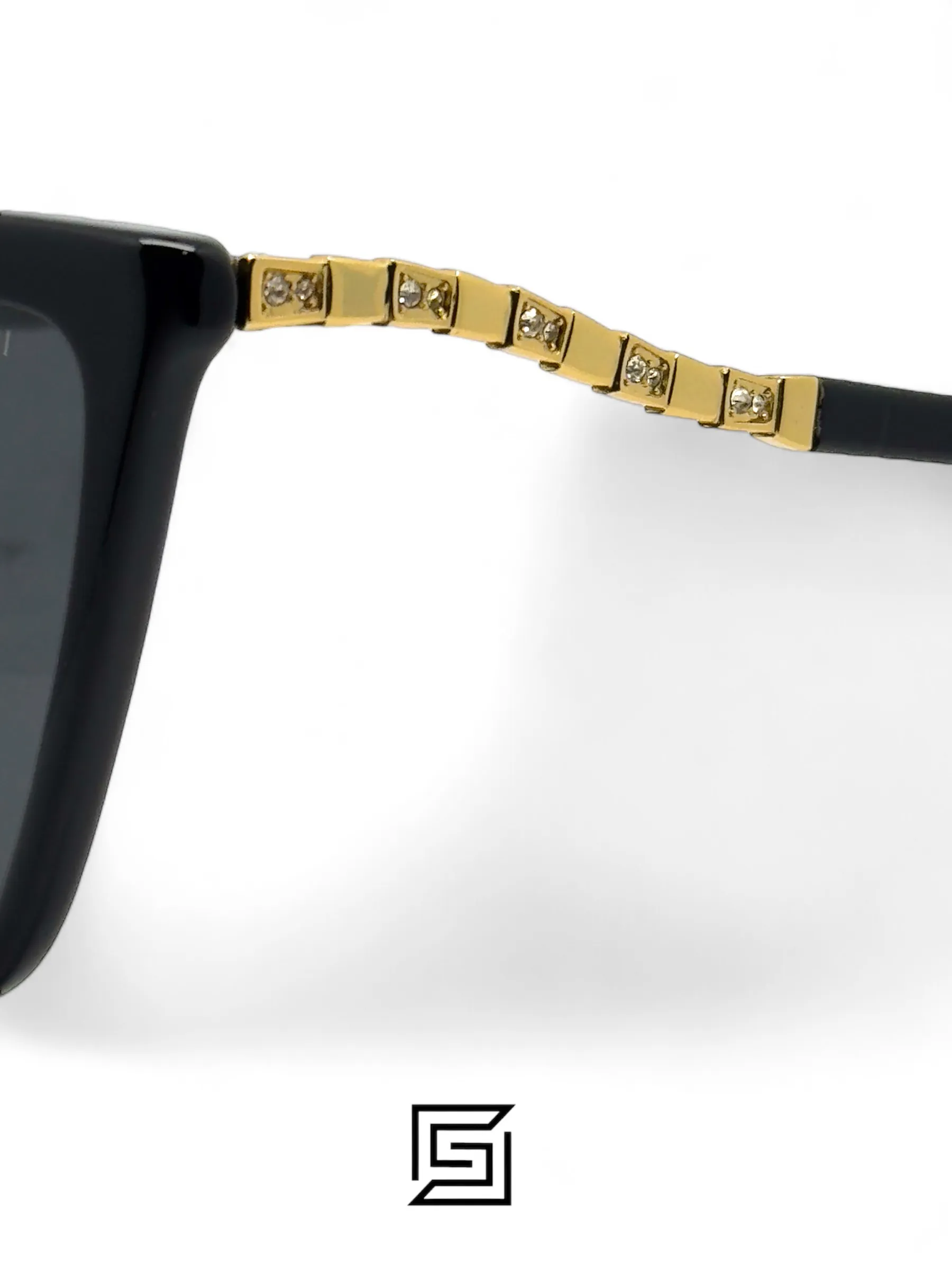 BVLGARI BV8255 sunglasses feature a classic acetate black frame with gold metal accents, black lenses, and a 57-17-140 fit. Elevate your style with this timeless design.