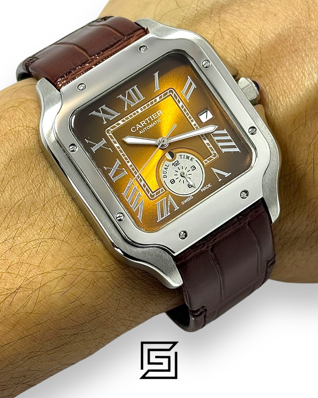 Elevate your style with the Cartier Santos watch. Featuring a 47mm stainless steel case, brown leather band, and brown dial, this Japanese automatic movement timepiece exudes luxury and sophistication. Shop now!
