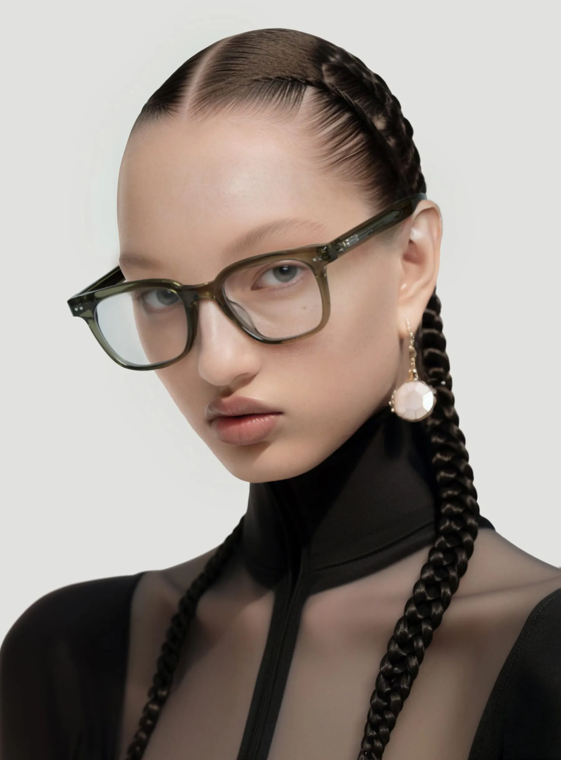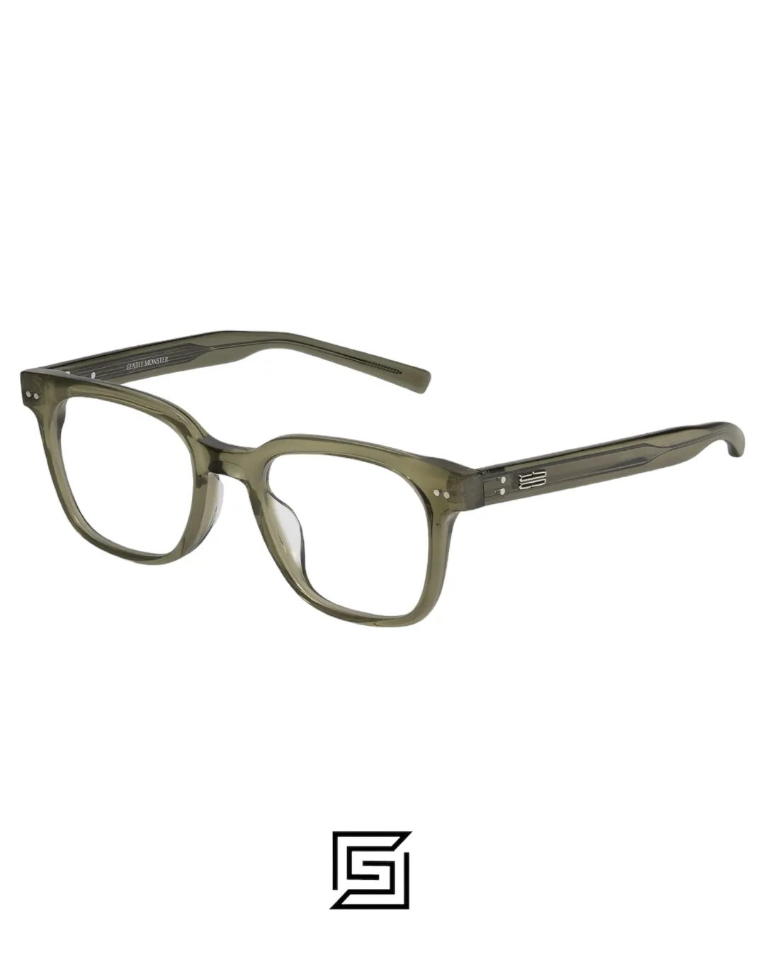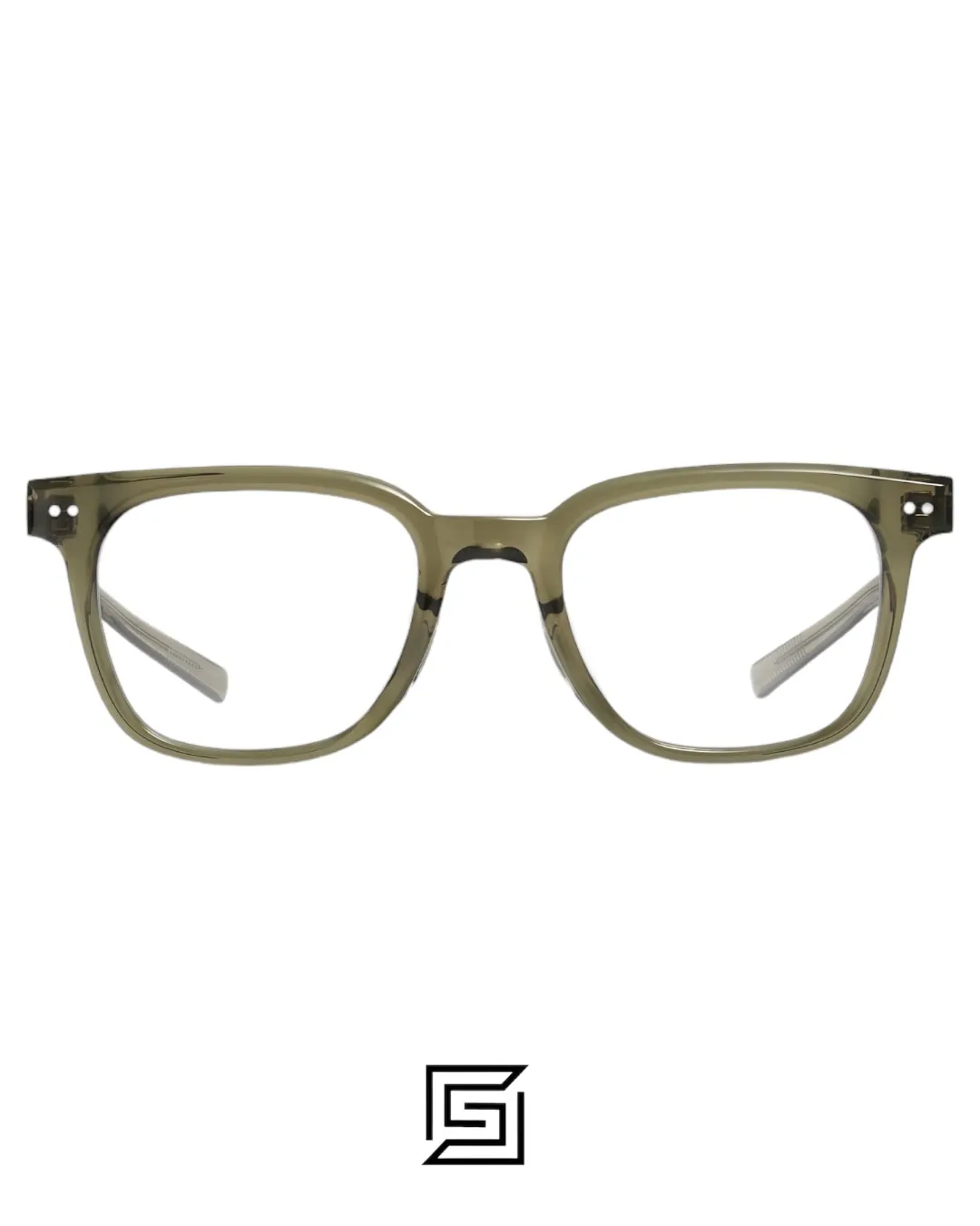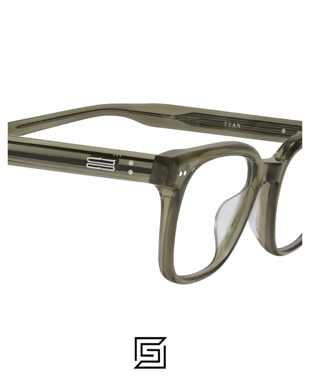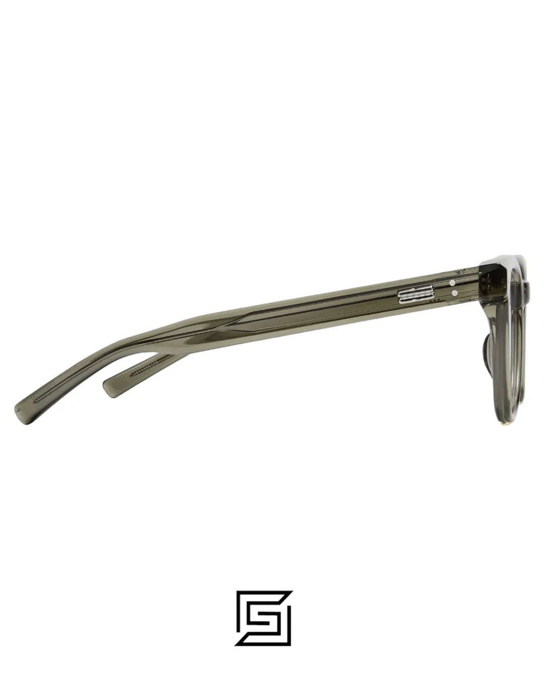 Stylish translucent khaki acetate sunglasses with clear lenses and a square shape. Perfect for a modern and trendy look. Lens width: 52mm, lens height: 42.3mm. Bridge: 22mm.