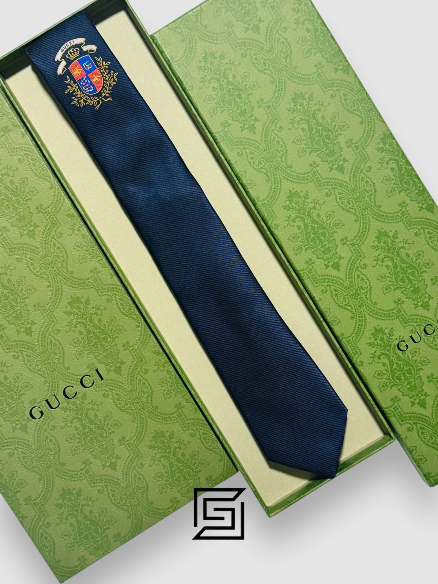 Genuine Gucci navy blue silk sunglasses (7cm width, 148cm length). Includes original box and bag. Experience luxury eyewear.