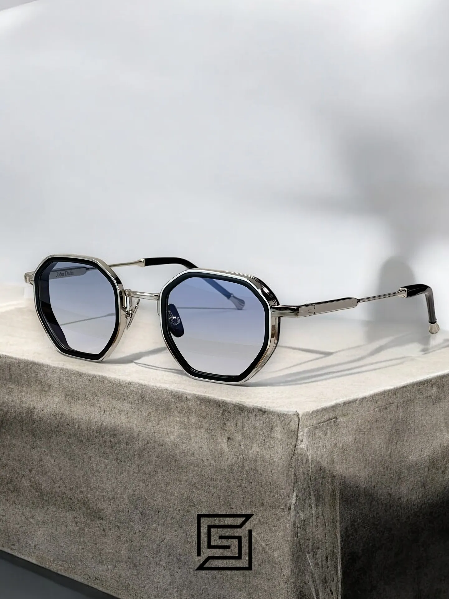 JOHN DALIA HARRISON sunglasses. Silver metal frame with blue-grey lenses. 47-23-145 dimensions. Stylish and durable. Perfect for any occasion. Shop now!
