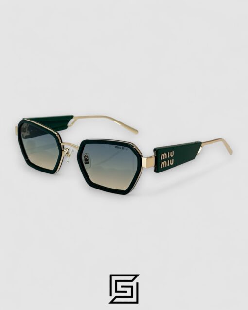 Sophisticated rectangular sunglasses. Green acetate & gold metal frame with ultra-flat lenses offer 100% UVA/UVB protection. Lightweight & luxurious with Miu Miu logo. 54-23-145 mm. SMU11W.