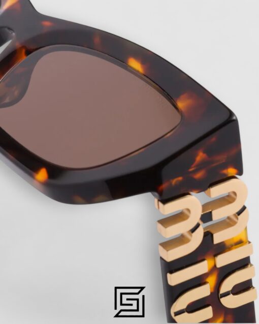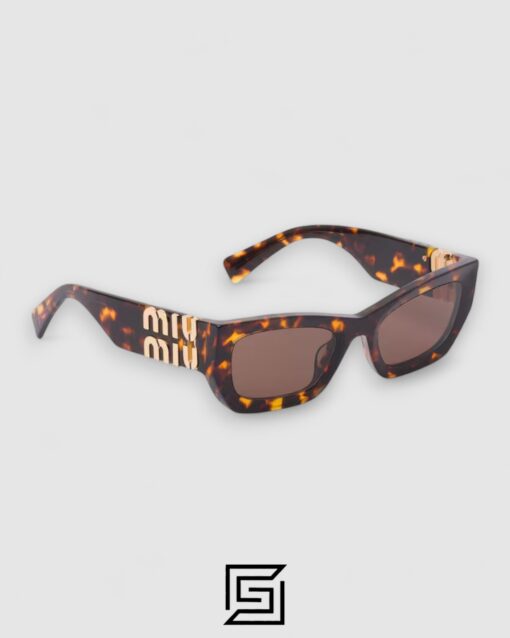 Acetate sunglasses with a sophisticated rectangular shape. The frame features thin rims and ultra-flat lenses that highlight the extreme lightness. The vertical Miu Miu logo adds its signature to the temples for a refined touch.