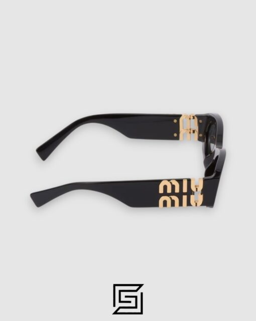 Acetate sunglasses with a sophisticated rectangular shape. The frame features thin rims and ultra-flat lenses that highlight the extreme lightness. The vertical Miu Miu logo adds its signature to the temples for a refined touch.