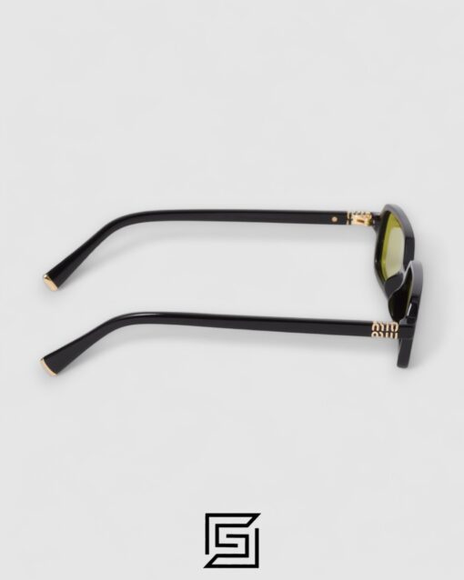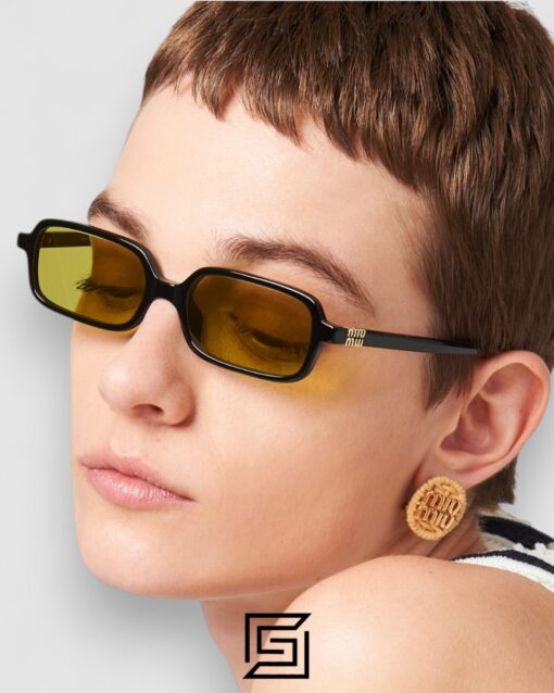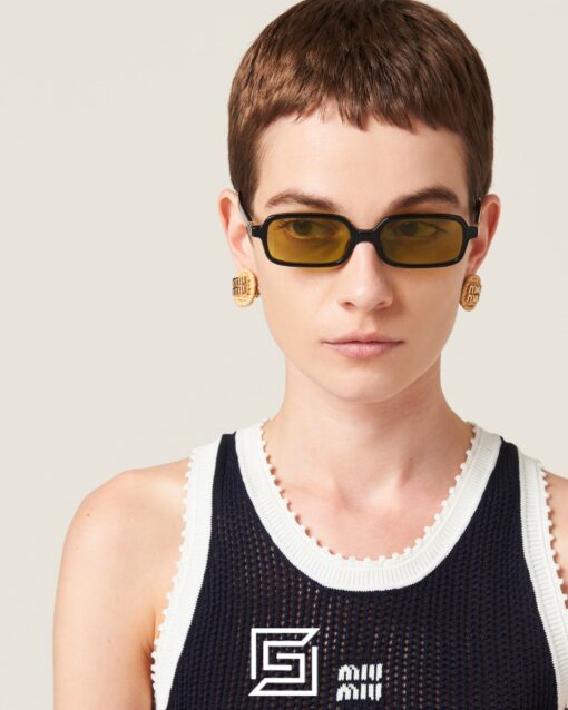 Acetate sunglasses with a sophisticated rectangular shape. The frame features thin rims and ultra-flat lenses that highlight the extreme lightness. The vertical Miu Miu logo adds its signature to the temples for a refined touch.