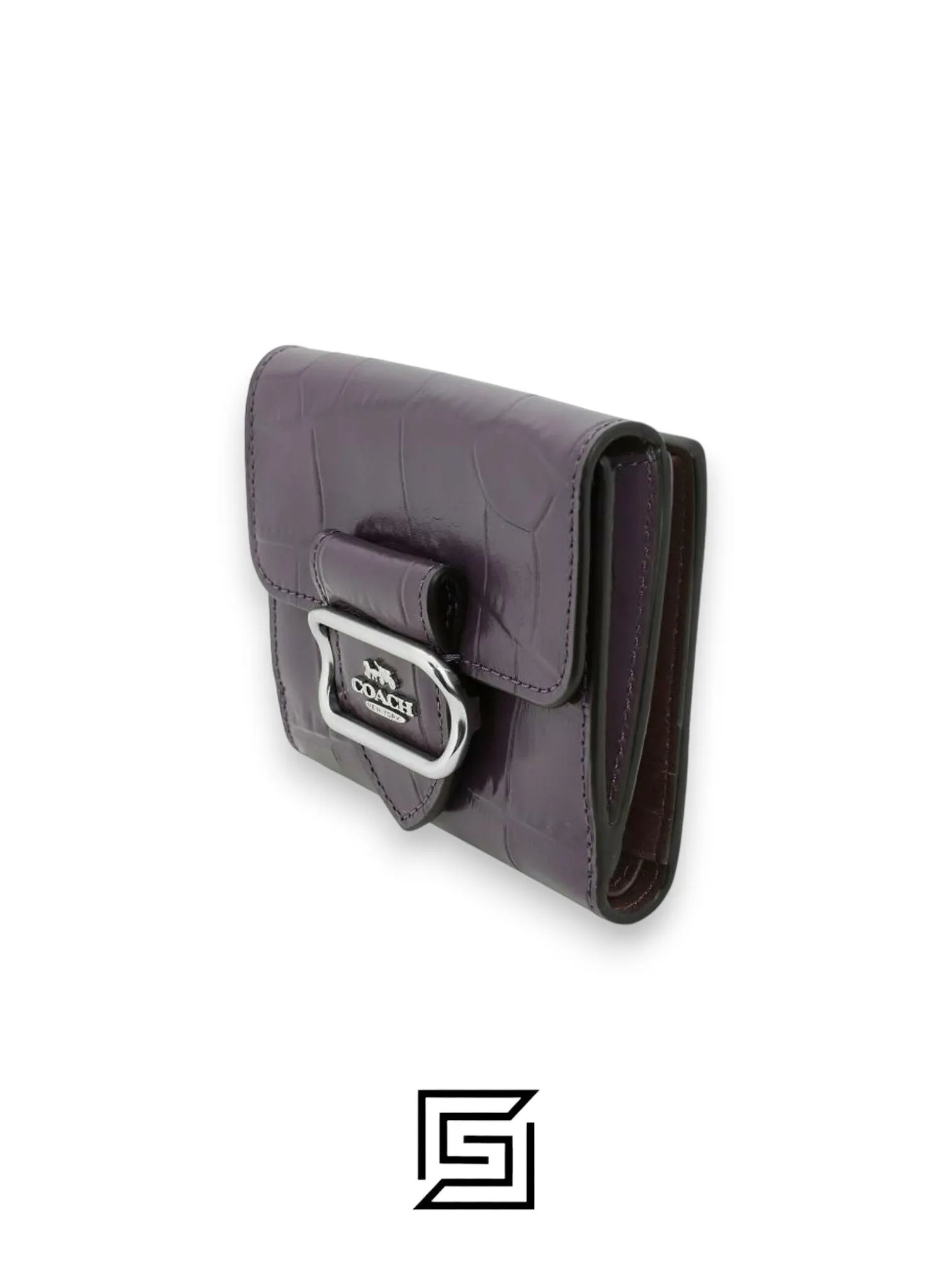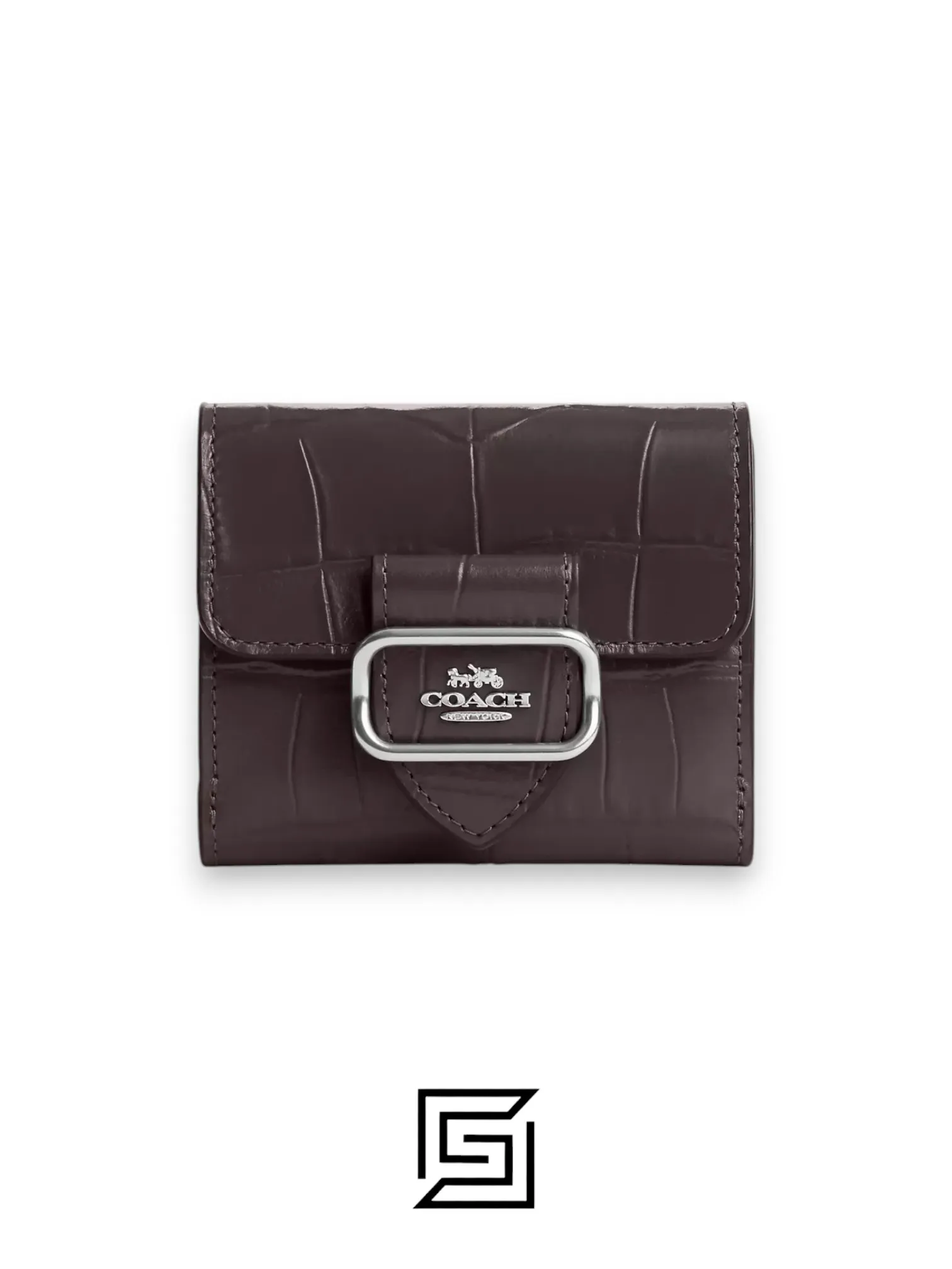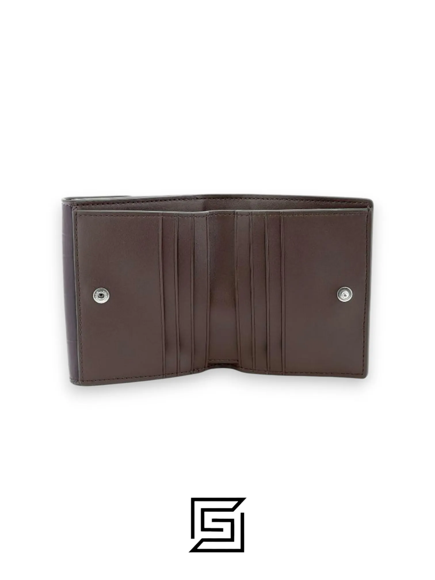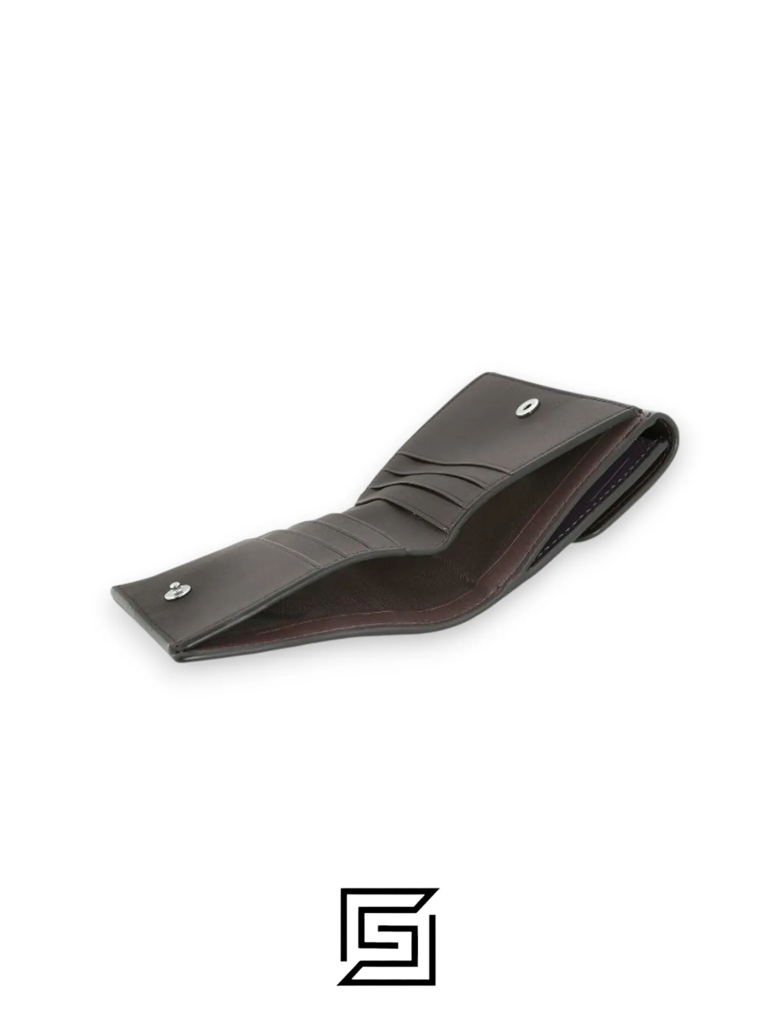Refined pebble leather wallet with six credit card slots, full-length bill compartment, snap closure, and outside coin pocket. Dimensions: