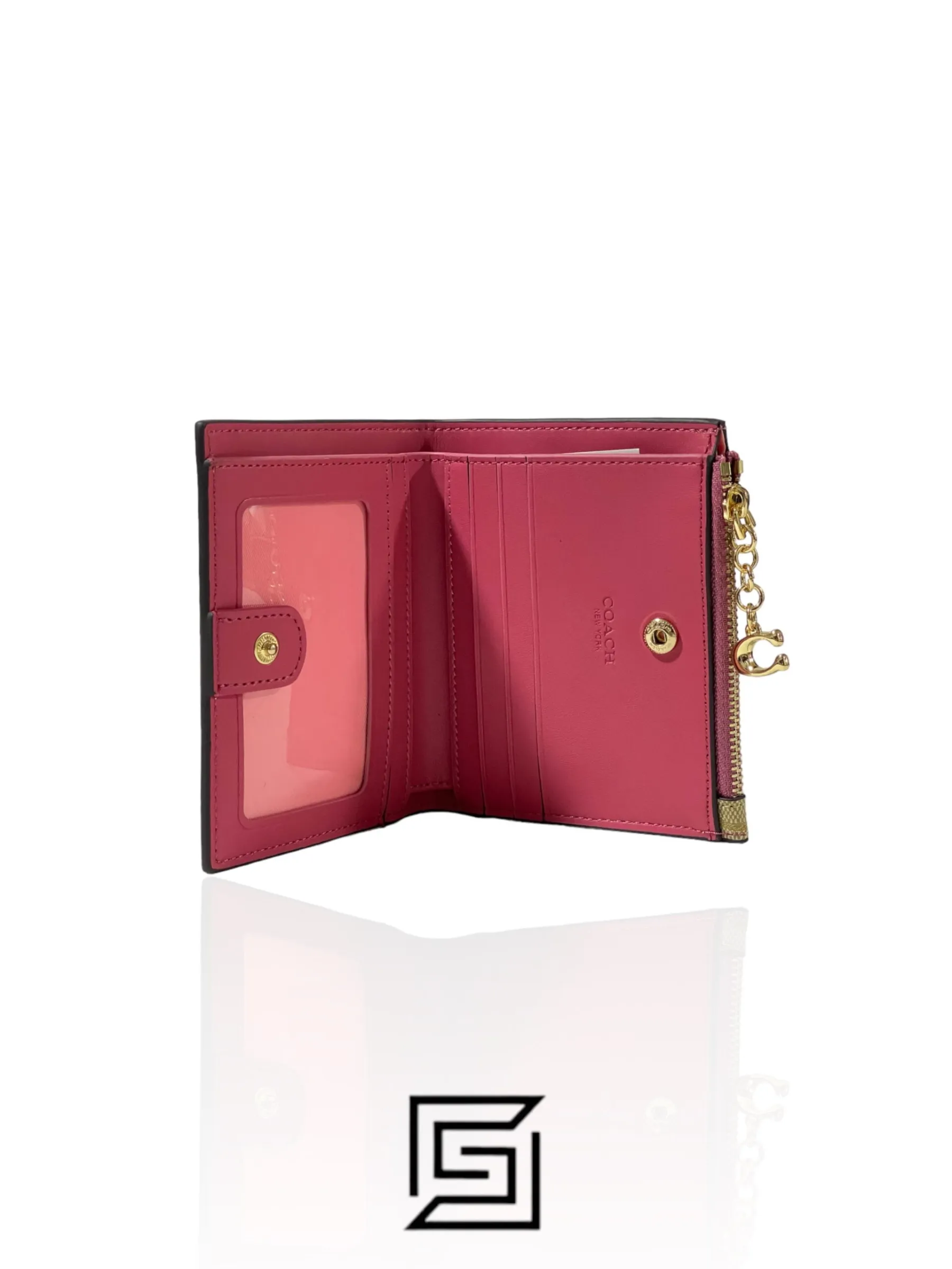 Stylish signature coated canvas wallet with three credit card slots, full-length bill compartment, ID window, snap closure, and zip coin pocket. Dimensions: 11.43cm x 9.53cm. Style No. F78002. Perfect for everyday use.