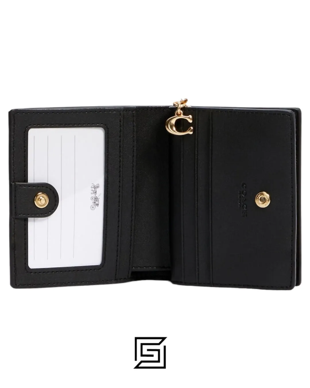 Stylish and practical wallet featuring printed coated canvas and smooth leather. Holds 3 cards, ID, bills, and coins. Snap closure for security. Size: 12.5 X 9 CM.