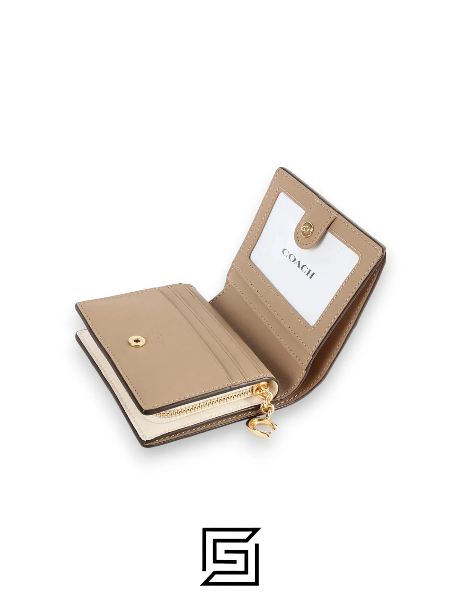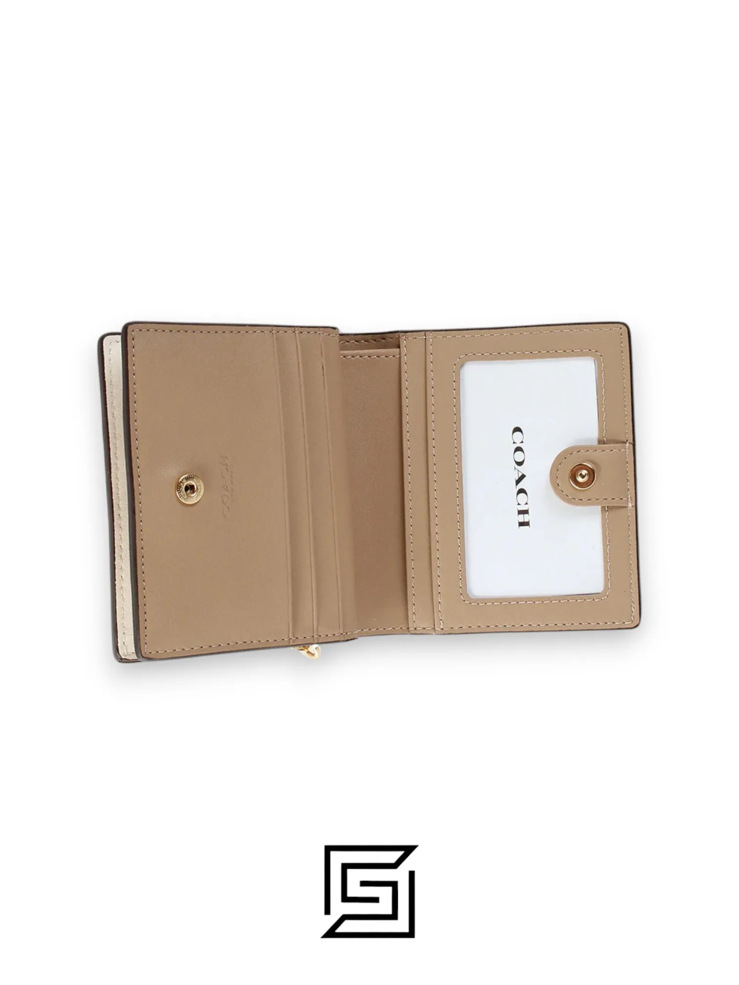 Stylish printed canvas & leather wallet. Holds 3 cards, ID, bills & coins. Snap closure & zip coin pocket. Compact size: 12.5 x 9 cm. Perfect everyday accessory!