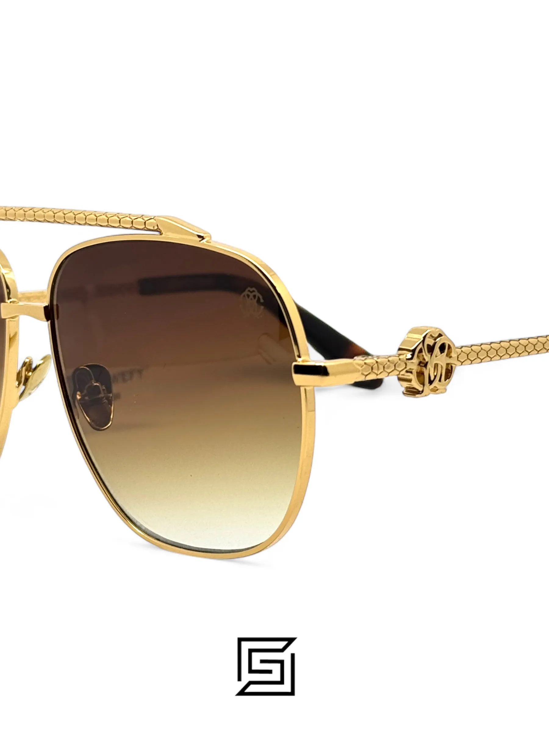 Roberto Cavalli SRC008v sunglasses in gold metal frame with honey lenses. Features 62mm lens width, 13mm bridge, and 145mm temples. A stylish and elegant choice for any occasion.