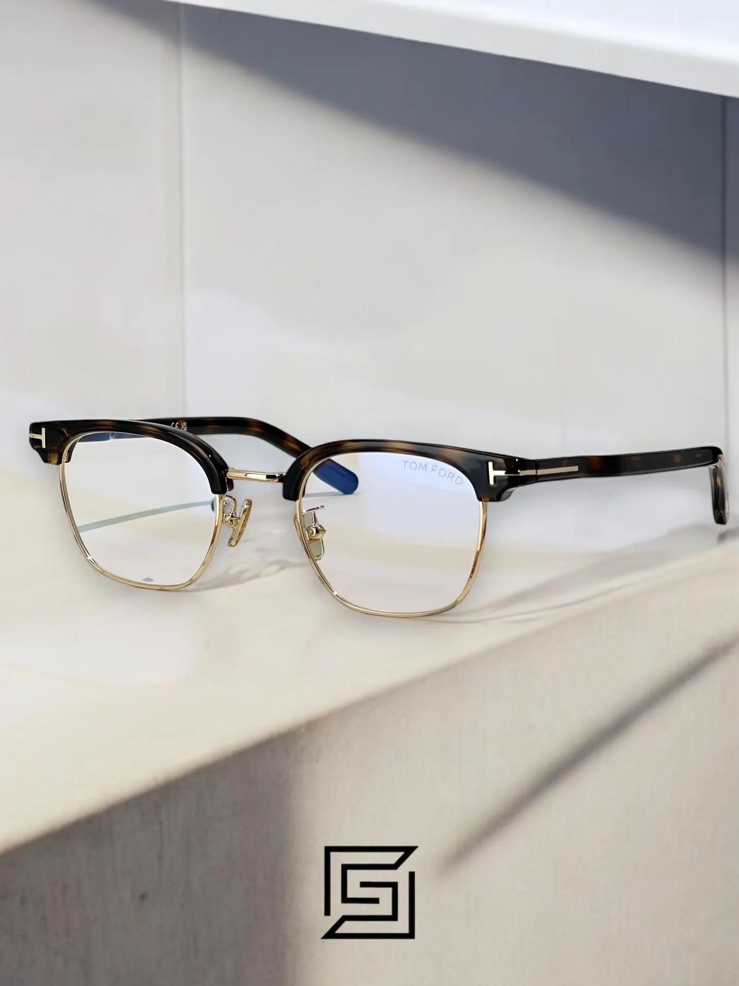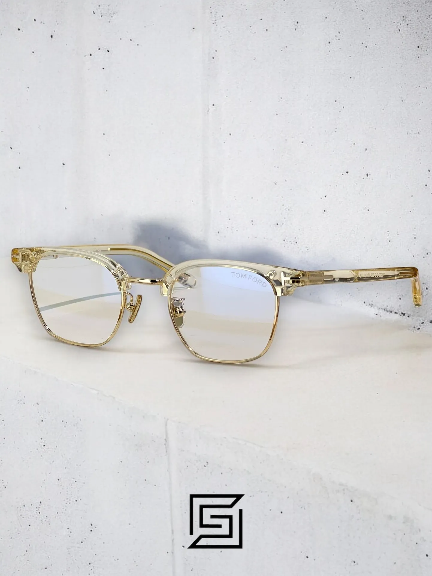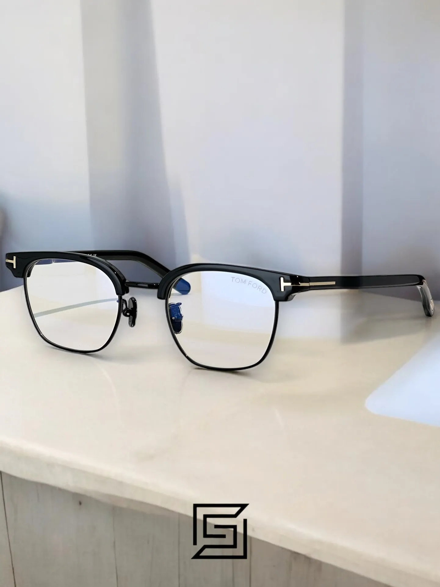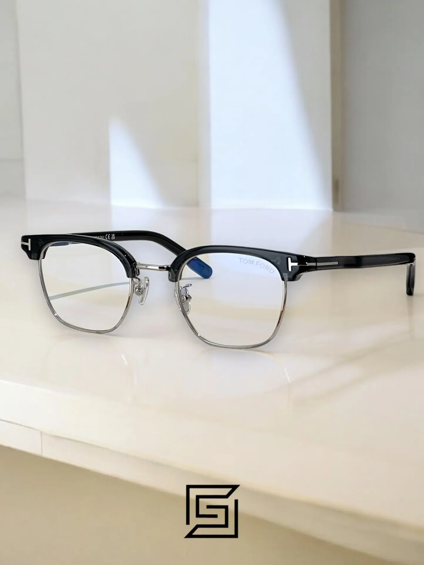 Tom Ford TF5932 sunglasses in acetate. Black-transparent-blue-tiger-trans dark grey frame with optics lenses. 47-21-145 dimensions. Experience luxury eyewear.