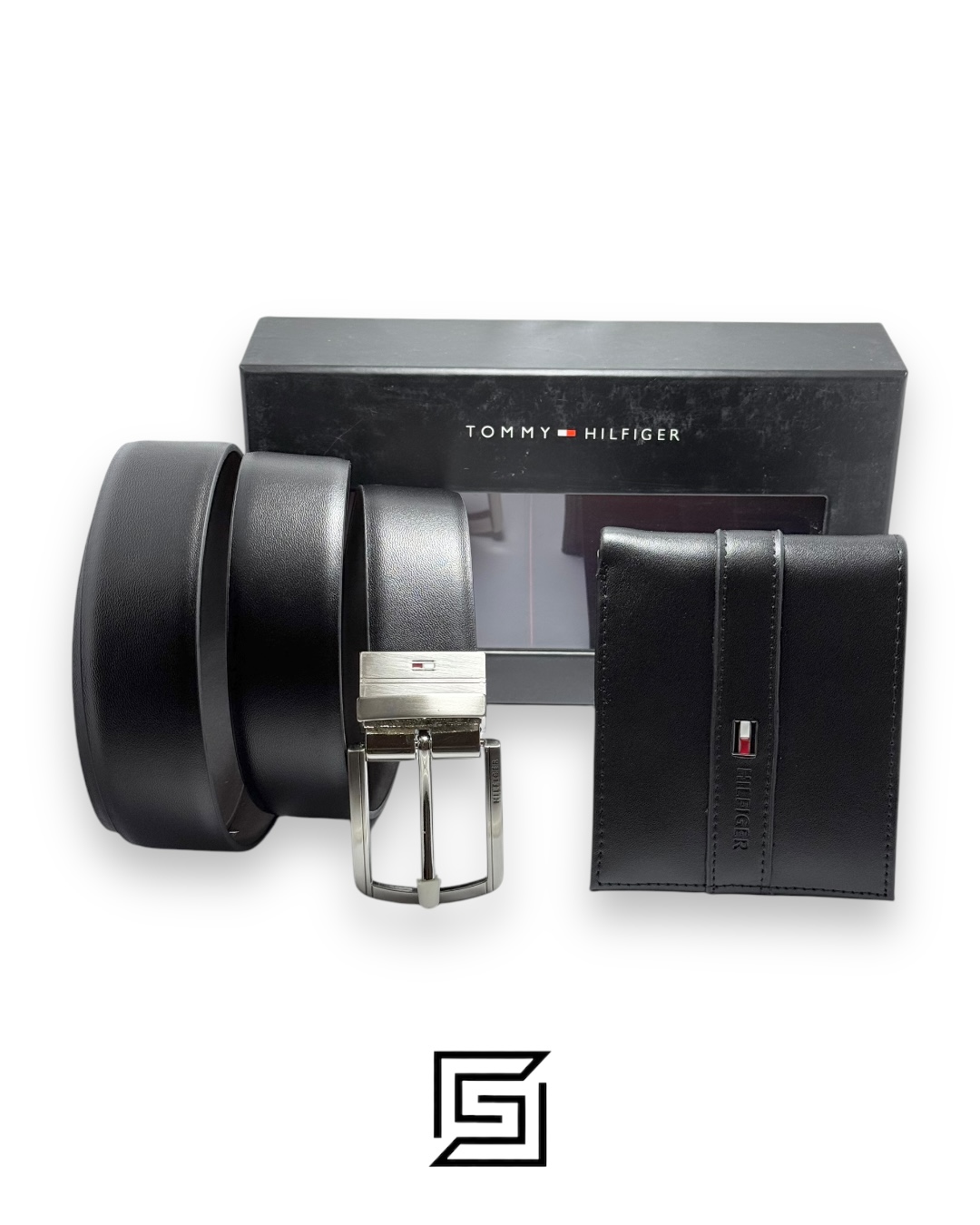 TOMMY SET BELT AND WALLET HILLFIGER HARD LOGO IN MIDDLE SILVER LOGO BLACK BELT