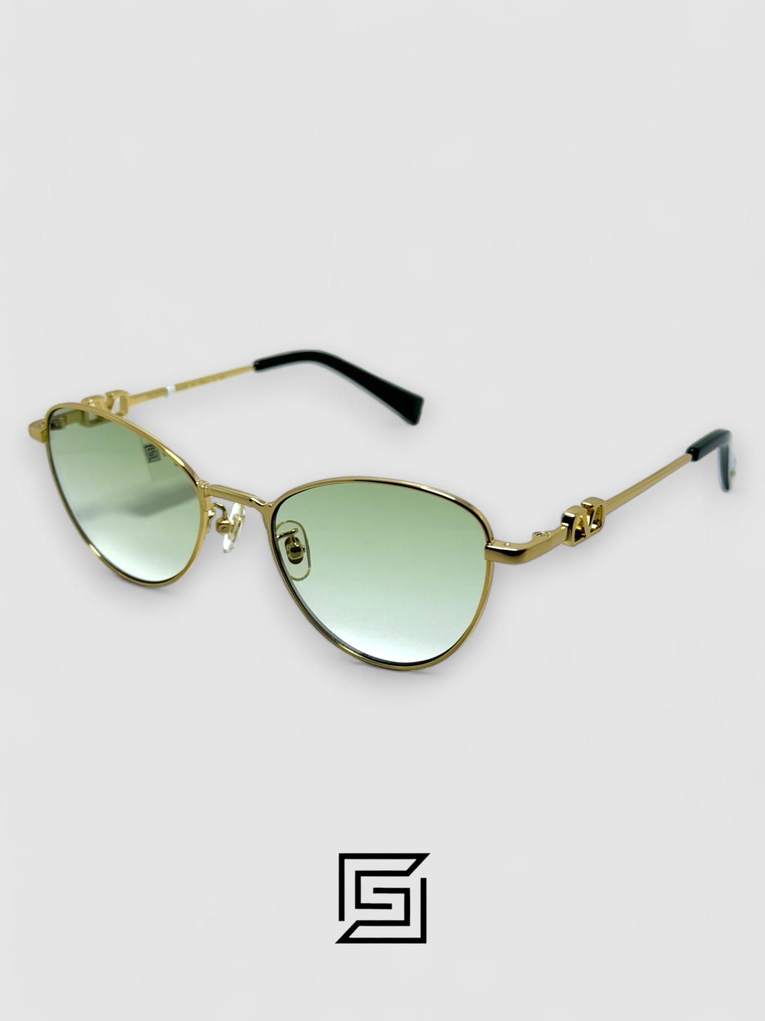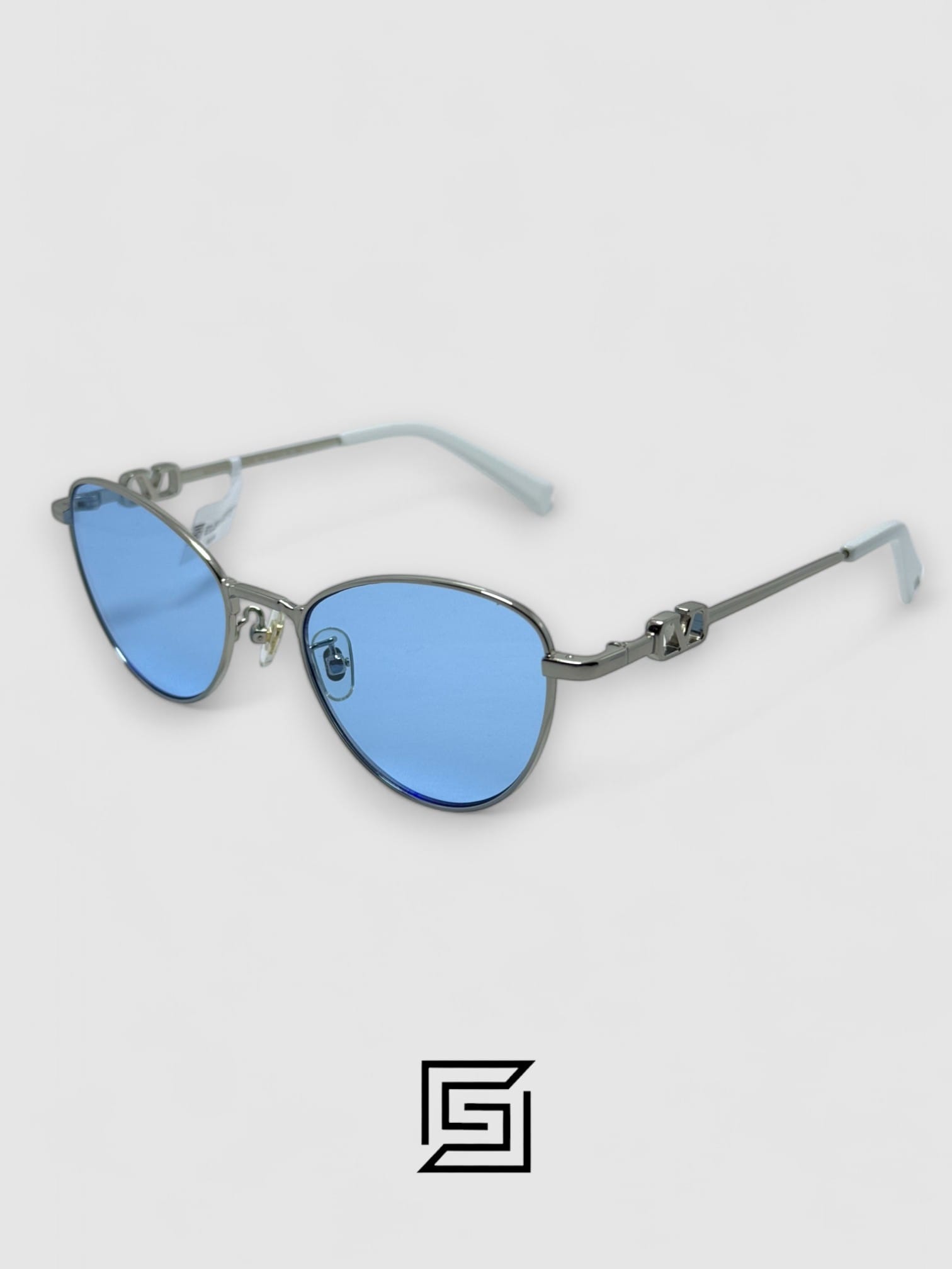 Valentino VA3340 sunglasses in silver-gold metal frame with blue-green lenses. Features 55mm lens width, 20mm bridge, and 143mm temples. Stylish and sophisticated design. Shop now!